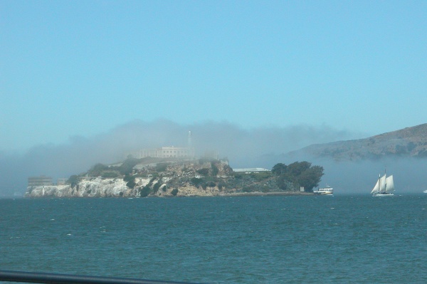 De rondvaart zal onder de Golden Gate Bridge doorgaan en vervolgens om Alcatraz heen varen. Het geluk zit ons echter niet mee, zodra het schip uitvaart rolt er vanaf zee een flinke mist de baai in en als wij bij de brug zijn is er ondertussen niets meer van te zien. Gelukkig is Alcatraz nog wel in de mist te ontwaren en kunnen we er een goede blik op werpen.