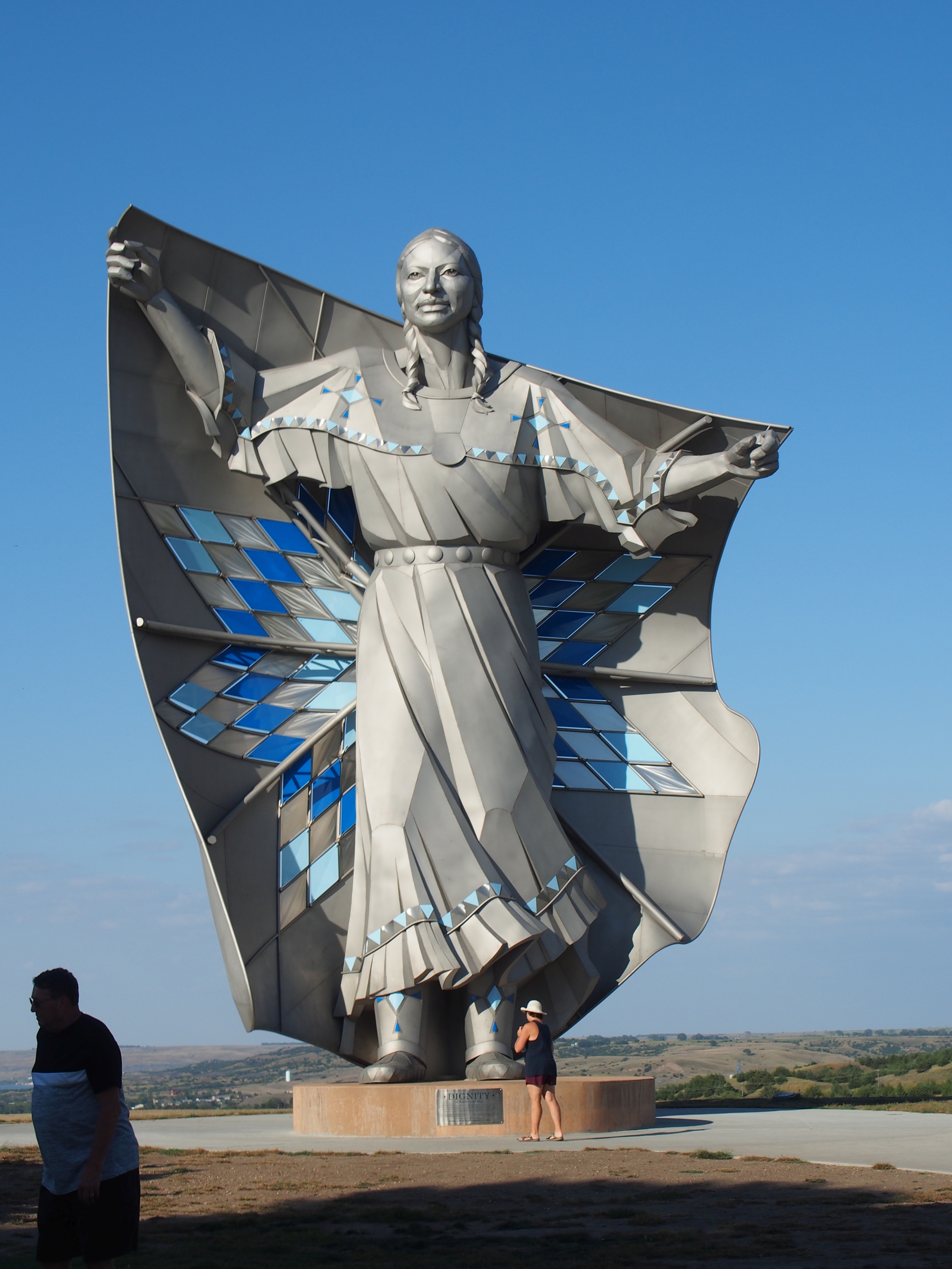 Gelukkig kom je zo af en toe nog iets anders tegen. Zo stond er plots een gigantisch beeld van een vrouwelijk indiaan bij een rustplaats langs de weg. Geen idee wie of wat het precies is maar mooi is het wel.