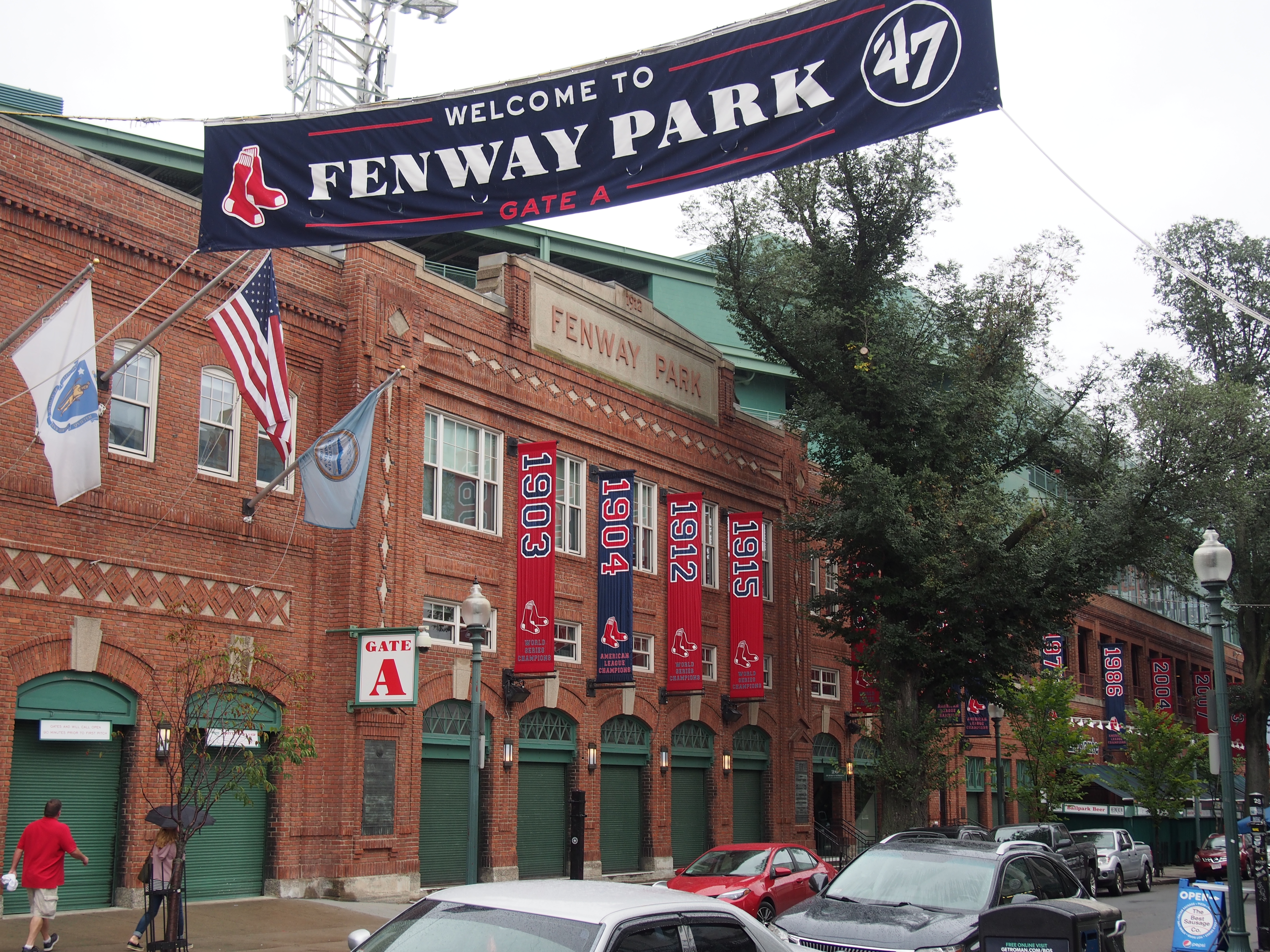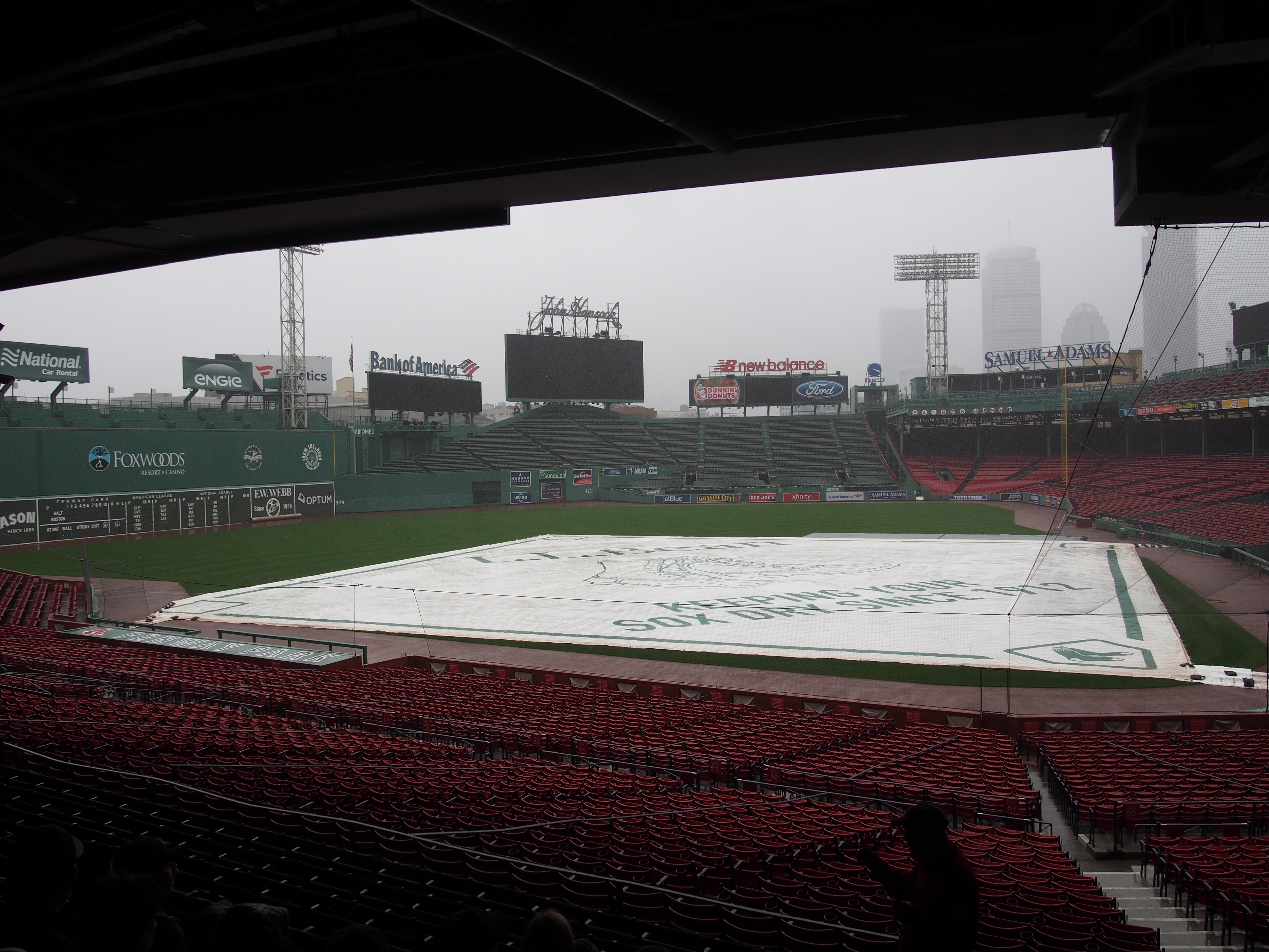 We kijken eerst nog even rond in de Team Store en om 15:00 hebben we een rondleiding door het stadion. Ondertussen begint de regen ongeveer op een zondvloed te lijken en het is een oud stadion, het oudste van Amerika uit 1912, dus geen dak. Dat kan nog leuk worden. Gelukkig zijn er ook grote overdekte gedeeltes maar al met al worden we behoorlijk nat.