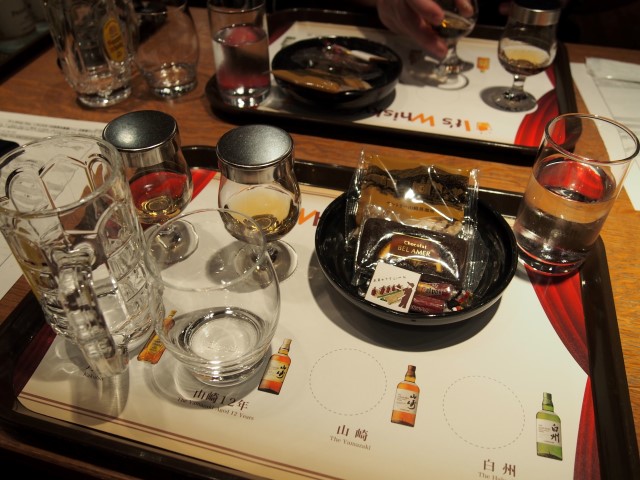 Na de rondleiding is het dan eindelijk tijd om te proeven. Vooer idereen staat een dienblad opgesteld met de nodige whisky, water, glazen en zelfs wat hapjes. Er volgt een uitleg over hoe de verschillende whisky's gedronken dienen te worden, in het japans. Met een beetje afkijken bij de buren lukt het aardig om de strekking van het verhaal te volgen. Wat opvalt is dat men hier heel veel whisky met soda en ijs drinkt. Wat ons betreft erg zonde van de goede whisky.